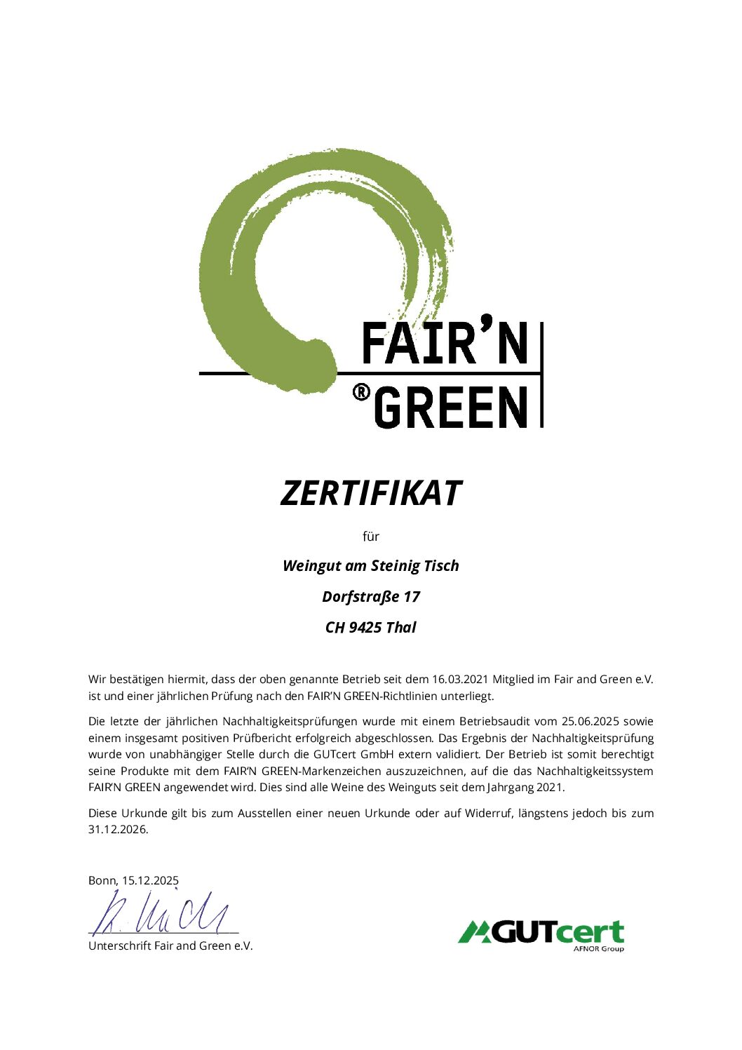 Das «FAIR’N GREEN»-Siegel gilt im Weinbau als anerkanntes Nachhaltigkeitssiegel für Winzerbetriebe, die auf naturnahen Weinbau und die Förderung der Biodiversität setzen. Wir sind stolz darauf, dass wir mit «FAIR’N GREEN» unseren nachhaltigen Anspruch unter Beweis stellen dürfen.